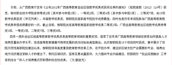 广西教育厅网站发布我院荣获2012年广西高等教育自治区级15项教学成果奖的信息 来源:柳州职业技术学院新闻网 作者:崔智慧 编审: 发布时间:2012-12-27 浏览次数: 次 【字体:小 大】 分享到: 2012年12月26日,广西教育厅网站发布我院荣获2012年广西高等教育自治区级15项教学成果奖的信息。(崔智慧) 信息截图 关闭 打印正文