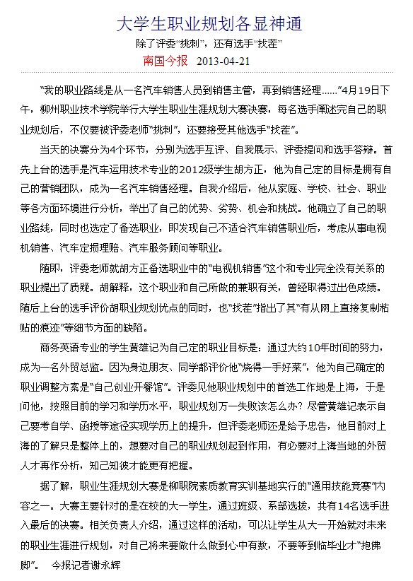 南国今报刊发我院进行职业生涯规划大赛的新闻 来源:柳州职业技术学院新闻网 作者:石玉丹 编审: 发布时间:2013-04-22 浏览次数: 次 【字体:小 大】 分享到: 南国今报2013年4月21日18版头条刊发我院进行职业生涯规划大赛的新闻。(石玉丹) 关闭 打印正文