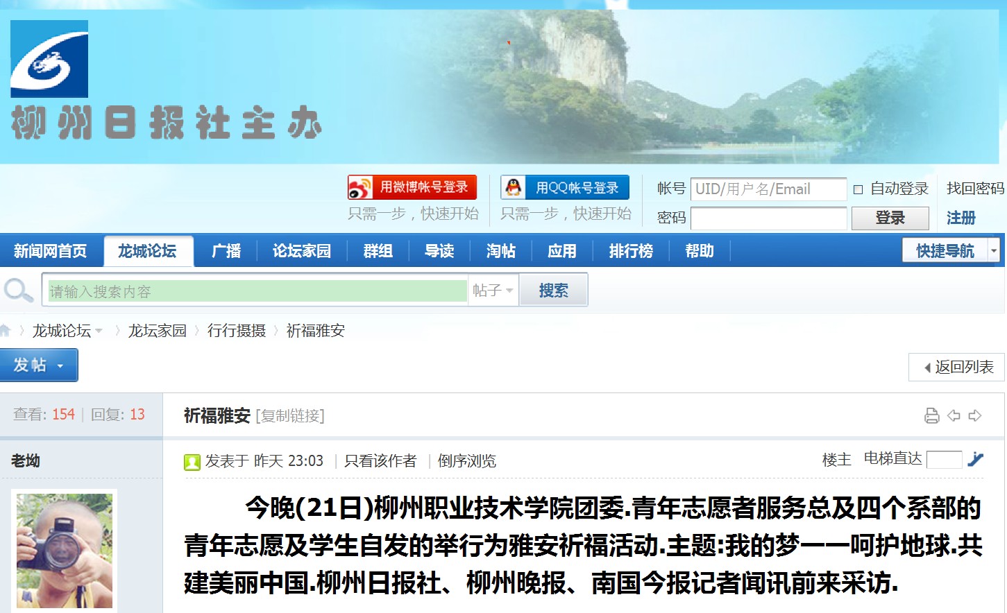 柳州新闻网发布我院志愿者自发举行为雅安祈?;疃男畔? 来源:柳州职业技术学院新闻网 作者:崔智慧 编审: 发布时间:2013-04-22 浏览次数: 次 【字体:小 大】 分享到: 2012年4月22日,柳州新闻网“龙城论坛”栏目发布我院志愿者自发举行为雅安祈?;疃男畔ⅰ#ù拗腔郏?/font> 信息截图 关闭 打印正文