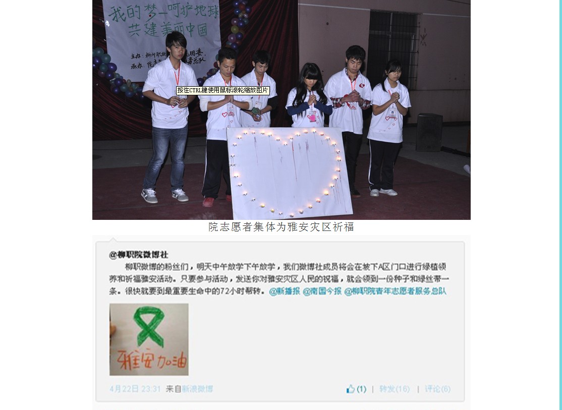 柳州教育局网站发布我院学生为雅安祈福的信息 来源:柳州职业技术学院新闻网 作者:崔智慧 编审: 发布时间:2013-04-25 浏览次数: 次 【字体:小 大】 分享到: 2013年4月24日,柳州教育局网站发布我院学生为雅安祈福的信息。(崔智慧) 信息截图 关闭 打印正文
