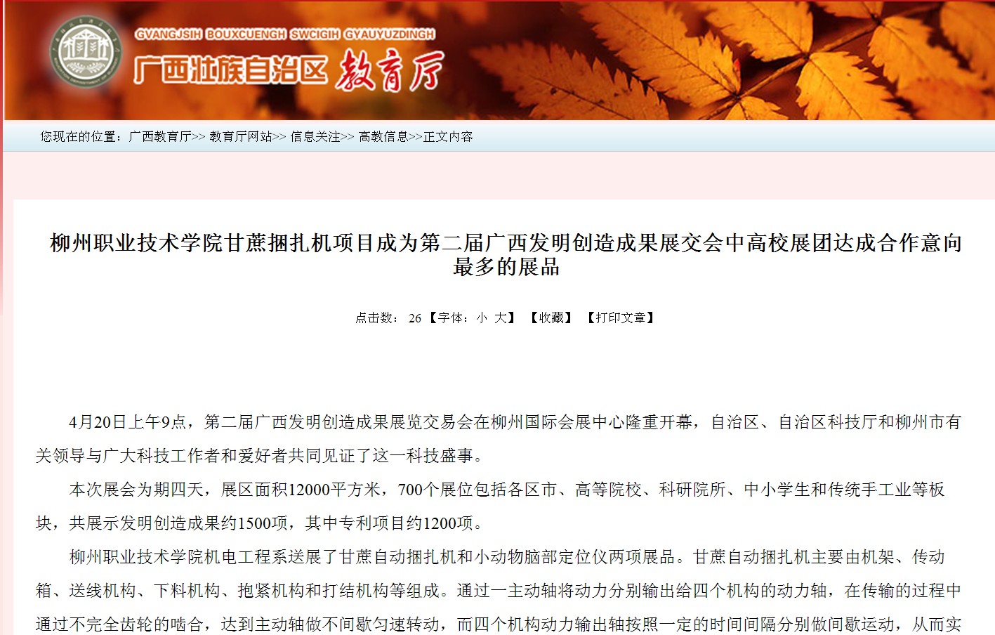 广西教育厅网站发布学院甘蔗捆扎机项目成为第二届广西发明创造成果展交会中高校展团达成合作意向最多的展品的信息