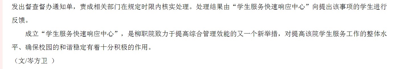广西教育厅网发布我院成立“学生服务快速响应中心”的信息 来源:柳州职业技术学院新闻网 作者:崔智慧 编审: 发布时间:2013-05-06 浏览次数: 次 【字体:小 大】 分享到: 2013年5月3日,广西教育厅网发布我院成立“学生服务快速响应中心”的信息。(崔智慧) 信息截图 关闭 打印正文
