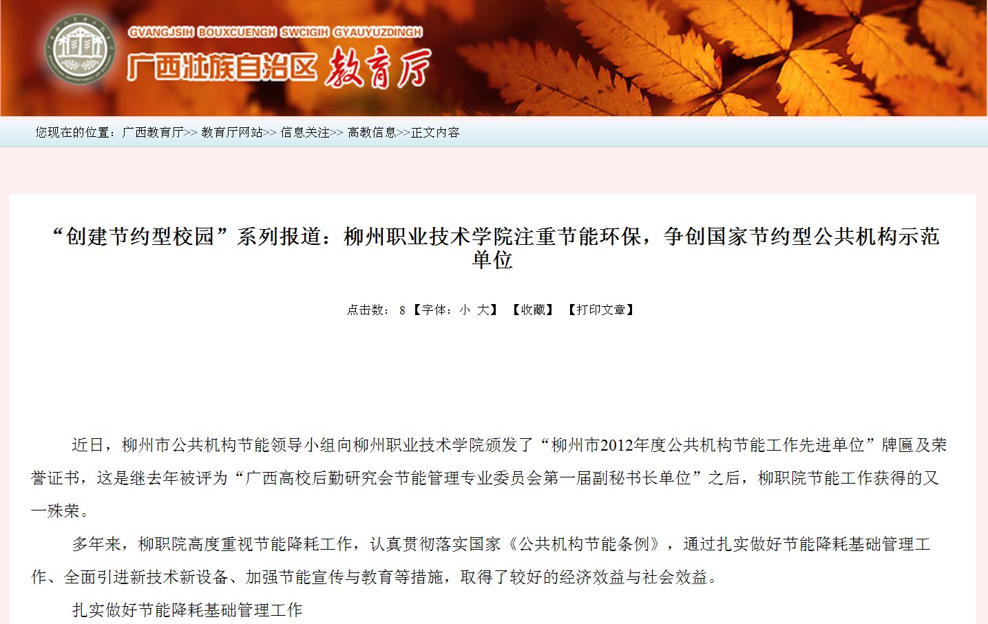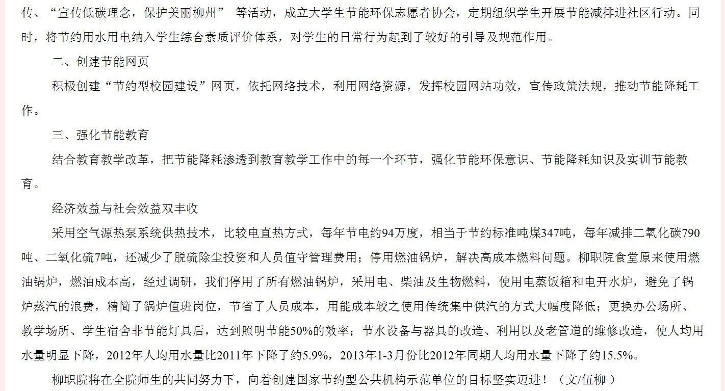 广西教育厅网站发布我院注重节能环保,争创国家节约型公共机构示范单位的信息 来源:柳州职业技术学院新闻网 作者:崔智慧 编审: 发布时间:2013-05-15 浏览次数: 次 【字体:小 大】 分享到: 2013年5月14日,广西教育厅网站发布我院注重节能环保,争创国家节约型公共机构示范单位的信息。(崔智慧) 信息截图 关闭 打印正文
