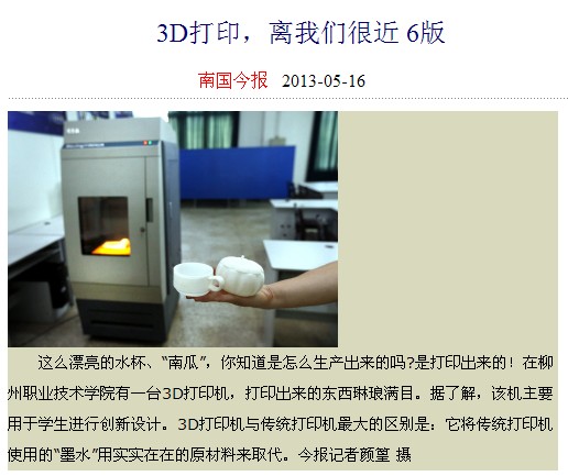 南国今报刊发我院拥有3D打印技术的新闻 来源:柳州职业技术学院新闻网 作者:石玉丹 编审: 发布时间:2013-05-16 浏览次数: 次 【字体:小 大】 分享到: 南国今报2013年5月16日在头版以主图导读、在第6版要闻版以大篇幅报道的形式,刊发我院拥有3D打印技术的新闻。(石玉丹) 关闭 打印正文