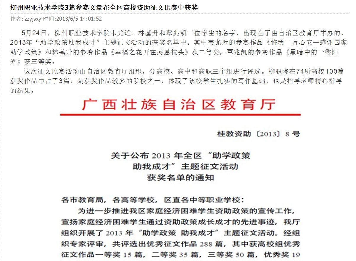 柳州教育局网站发布我院3篇参赛文章在全区高校资助征文比赛中获奖的信息 来源:柳州职业技术学院新闻网 作者:崔智慧 编审: 发布时间:2013-06-20 浏览次数: 次 【字体:小 大】 分享到: 2013年6月5日,柳州教育局网站发布我院3篇参赛文章在全区高校资助征文比赛中获奖的信息。(崔智慧) 信息截图 关闭 打印正文
