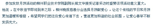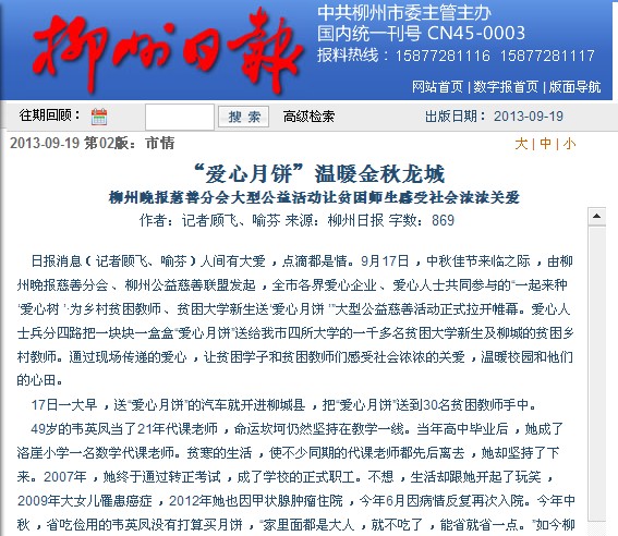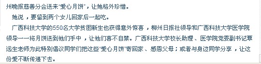 柳州日报刊发给柳职学子赠送月饼的新闻 来源:柳州职业技术学院新闻网 作者:石玉丹 编审: 发布时间:2013-09-27 浏览次数: 次 【字体:小 大】 分享到: 2013年9月19日,柳州日报第2版以《“爱心月饼”温暖金秋龙城》为题,刊发给柳职学子赠送月饼的新闻。(截图:石玉丹) 关闭 打印正文