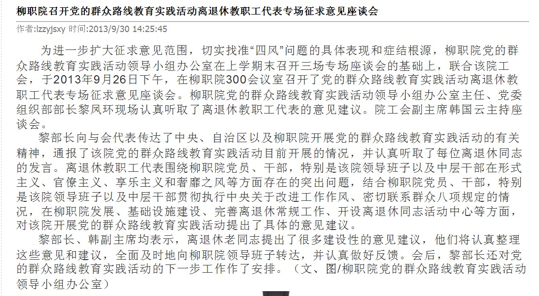 柳州教育局网站发布我院开展教育实践活动的信息 来源:柳州职业技术学院新闻网 作者:崔智慧 编审: 发布时间:2013-10-08 浏览次数: 次 【字体:小 大】 分享到: 2013年9月30日,柳州教育局网站发布我院开展教育实践活动的信息。(崔智慧) 信息截图 关闭 打印正文