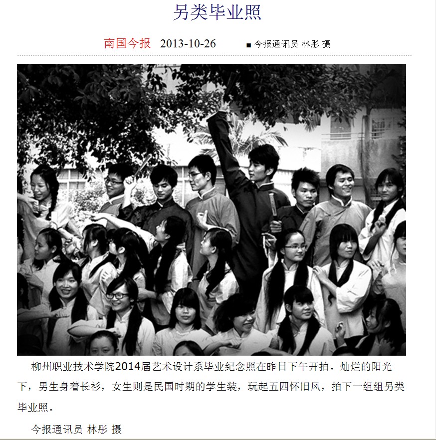 南国今报刊发我院大学生丰富多彩大学生活的新闻图片 来源:柳州职业技术学院新闻网 作者:石玉丹 编审: 发布时间:2013-10-28 浏览次数: 次 【字体:小 大】 分享到: 2013年10月26日,南国今报在第4版以《另类毕业照》为题,刊发我院大学生丰富多彩大学生活的新闻图片。(截图:石玉丹) 关闭 打印正文