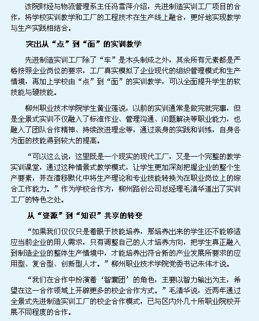 中国教育报近日刊发我院以模拟工厂提升学生实力的新闻 来源:柳州职业技术学院新闻网 作者:石玉丹 编审: 发布时间:2013-11-12 浏览次数: 次 【字体:小 大】 分享到: 2013年11月12日,中国教育报在第8版,以《模拟工厂提升学生软硬实力》为题,刊发我院以先进模式办学见实效的新闻。(截图:石玉丹) 关闭 打印正文