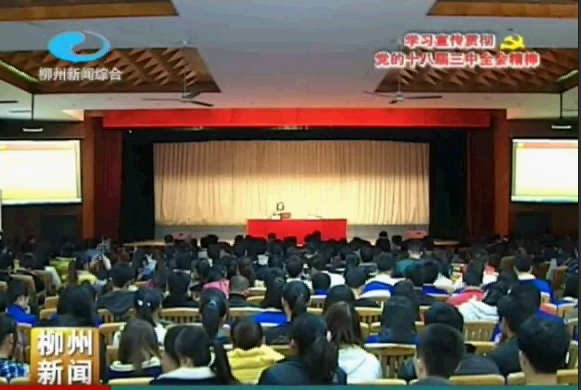 2013年12月5日,柳州电视台《柳州新闻》栏目播出自治区十八届三中全会精神宣讲团进柳州高校活动在我院举行的新闻。(朱敬民)
