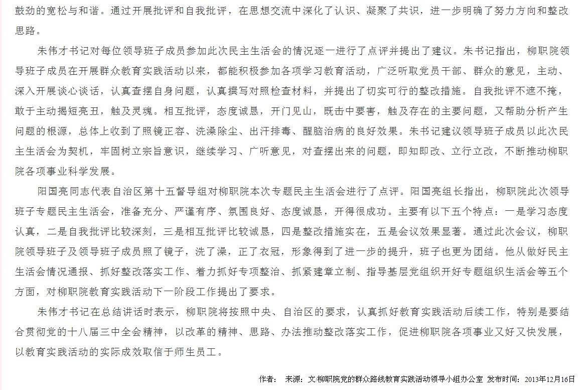 广西教育厅网站发布我院召开领导班子专题民主生活会的信息 来源:柳州职业技术学院新闻网 作者:崔智慧 编审: 发布时间:2013-12-16 浏览次数: 次 【字体:小 大】 分享到: 12月16日,广西教育厅网站发布我院召开领导班子专题民主生活会的信息。(崔智慧) 信息截图 关闭 打印正文