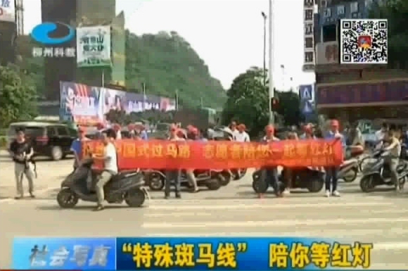 2014年5月12日,柳州电视台《新播报》栏目播出我院青年志愿者协助交警管理斑马线新闻。(新闻截图/朱敬民)