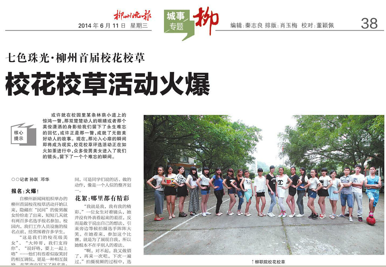 柳州晚报刊发我院学生参加“校花校草”活动的新闻 来源:柳州职业技术学院新闻网 作者:石玉丹 编审: 发布时间:2014-06-11 浏览次数: 次 【字体:小 大】 分享到: 2014年平6月11日,柳州晚报在第38版,以《?;ㄐ2莼疃鸨肺?,刊发我院学生参加“?;ㄐ2荨被疃耐计挛?。(截图:石玉丹) 关闭 打印正文