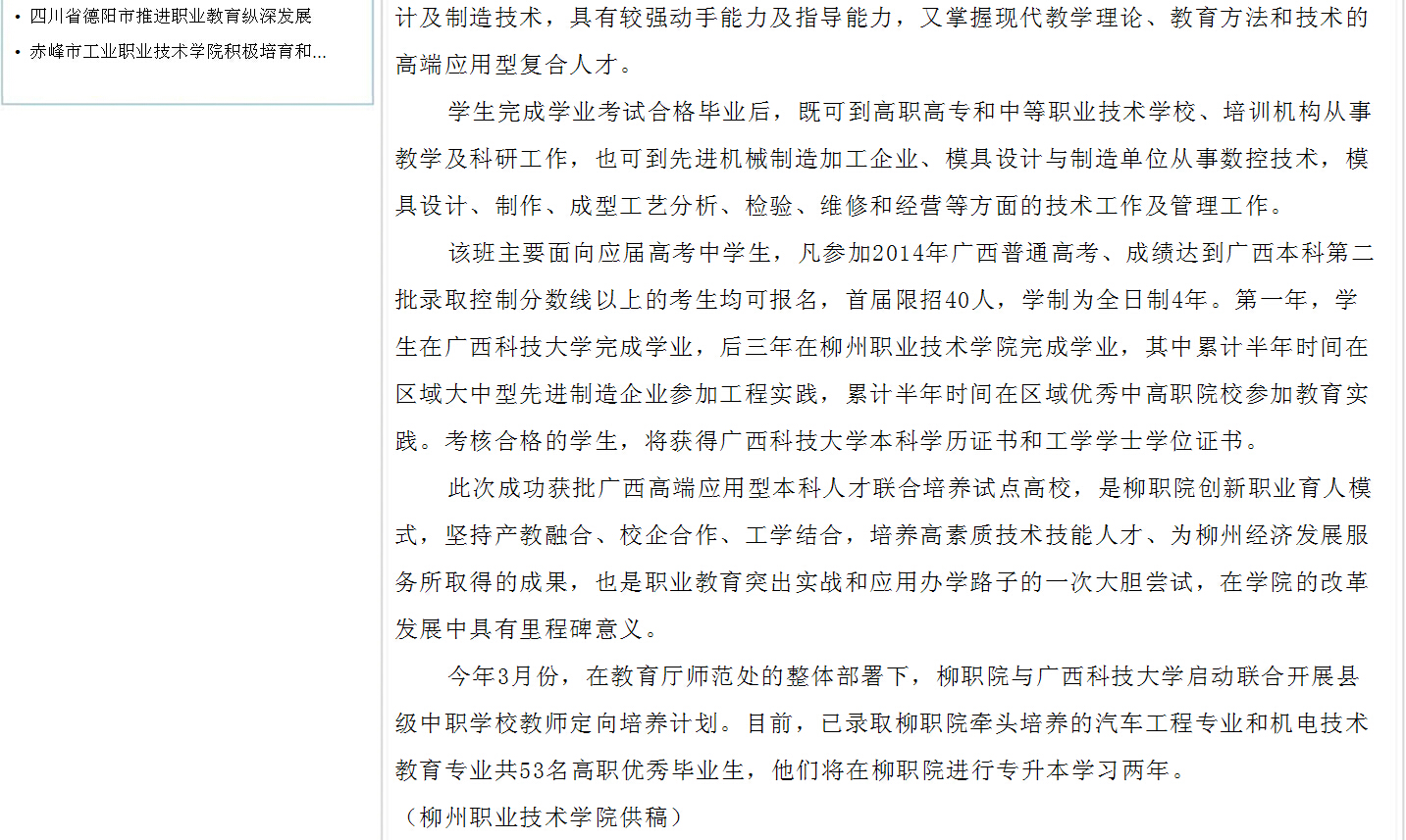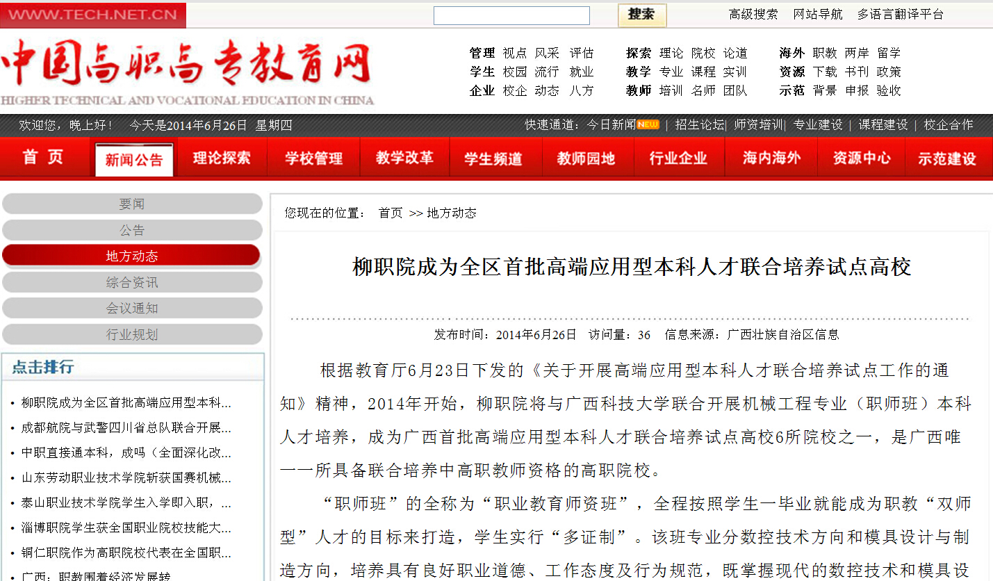 中国高职高专网发布我院成为全区首批高端应用型本科人才联合培养试点高校的信息 来源:柳州职业技术学院新闻网 作者:崔智慧 编审: 发布时间:2014-06-26 浏览次数: 次 【字体:小 大】 分享到: 2014年6月25日,中国高职高专网发布我院成为全区首批高端应用型本科人才联合培养试点高校的信息。(崔智慧) 信息截图 关闭 打印正文