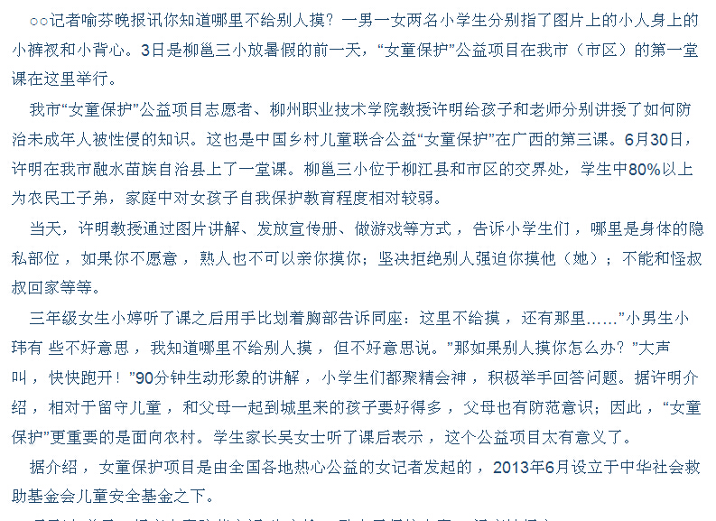 柳州晚报刊发我院开展女童?;す嫦钅炕疃男挛? 来源:柳州职业技术学院新闻网 作者:石玉丹 编审: 发布时间:2014-07-09 浏览次数: 次 【字体:小 大】 分享到: 2014年7月5日,柳州晚报在第5版,以“小裤衩小背心后面不给摸”为题,刊发我院开展女童保护公益项目活动的新闻。(截图:石玉丹) 关闭 打印正文