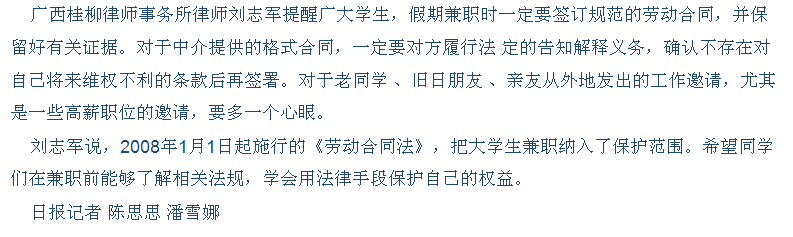 柳州日报刊发我院学子开展暑期勤工俭学活动的新闻 来源:柳州职业技术学院新闻网 作者:石玉丹 编审: 发布时间:2014-08-13 浏览次数: 次 【字体:小 大】 分享到: 2014年7月21日,柳州日报在第5版,以“勤工俭学保护自己”为题,刊发我院学子开展暑期勤工俭学活动的新闻。(截图:石玉丹) 关闭 打印正文