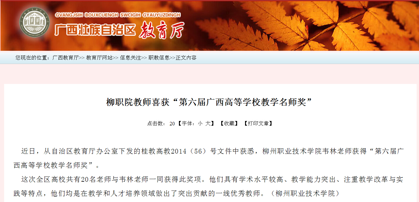2014年9月24日,广西教育厅网站发布我院教师喜获“第六届广西高等学校教学名师奖”的信息。(崔智慧)