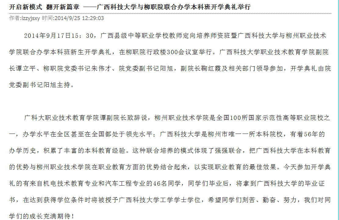 柳州教育局网站发布广西科技大学与柳职院举行联合办学本科班开学典礼的信息 来源:柳州职业技术学院新闻网 作者:崔智慧 编审: 发布时间:2014-10-08 浏览次数: 次 【字体:小 大】 分享到: 9月28日,柳州教育局网站发布广西科技大学与柳职院举行联合办学本科班开学典礼的信息。(崔智慧) 信息截图 关闭 打印正文