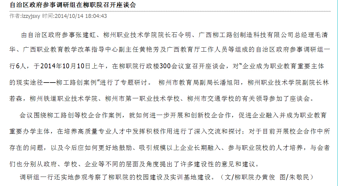 柳州教育局网站发布自治区政府参事调研组在我院召开座谈会的信息 来源:柳州职业技术学院新闻网 作者:崔智慧 编审: 发布时间:2014-10-23 浏览次数: 次 【字体:小 大】 分享到: 10月15日,柳州教育局网站发布自治区政府参事调研组在我院召开座谈会的信息。(崔智慧) 信息截图 关闭 打印正文