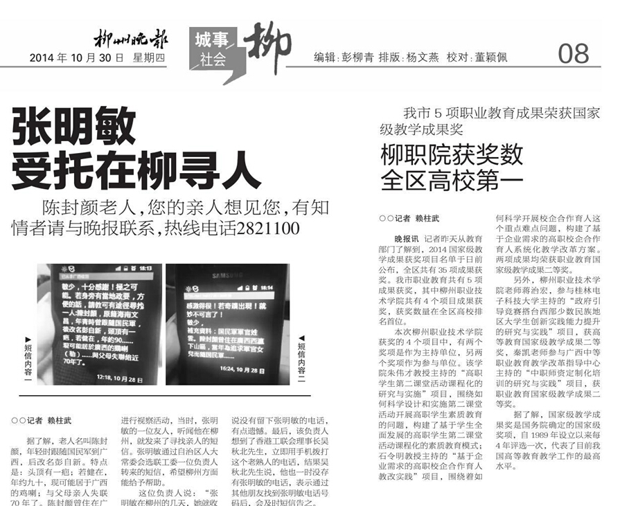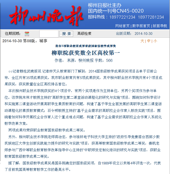 柳州晚报刊发我院获得四项国家级成果奖的消息 来源:柳州职业技术学院新闻网 作者:石玉丹 编审: 发布时间:2014-10-31 浏览次数: 次 【字体:小 大】 分享到: 2014年10月30日,柳州晚报在第8版以“柳职院获奖数全区高校第一”为题,刊发我院获得四项国家级成果奖的消息。(截图:石玉丹) 关闭 打印正文