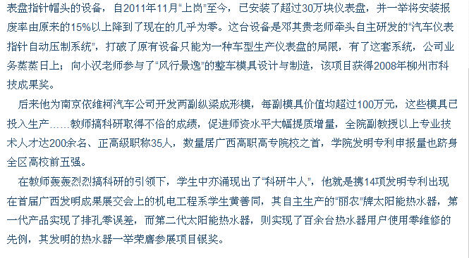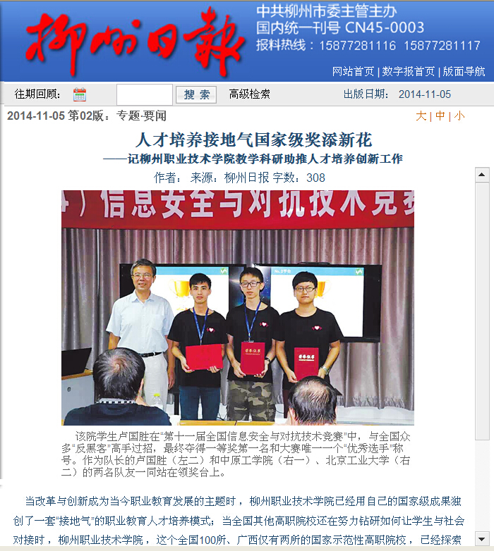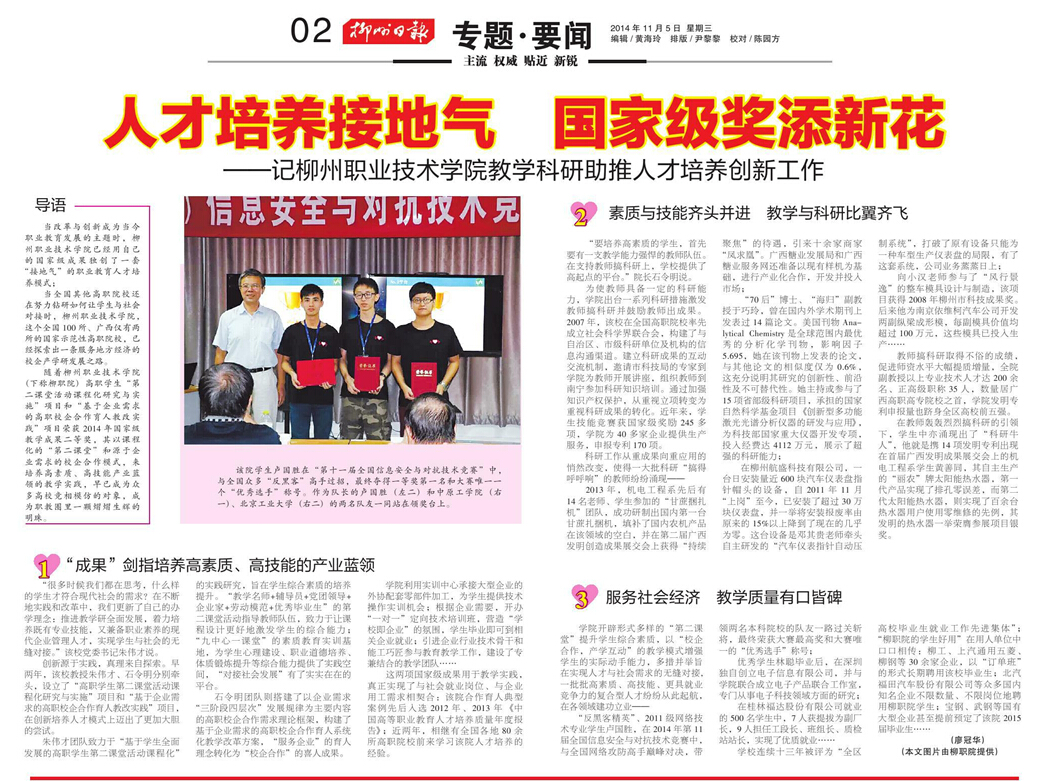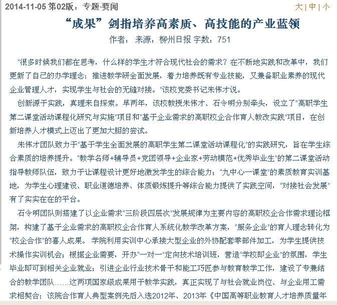 柳州日报刊发我院办学成果的新闻 来源:柳州职业技术学院新闻网 作者:石玉丹 编审: 发布时间:2014-11-05 浏览次数: 次 【字体:小 大】 分享到: 2014年11月5日,柳州日报在第二版,以“人才培养接地气 国家级奖添新花”为题,大篇幅刊发我院办学成果的新闻。(截图:石玉丹) 关闭 打印正文