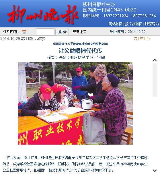 柳州晚报刊发我院家电维修部义务服务20年的新闻 来源:柳州职业技术学院新闻网 作者:石玉丹 编审: 发布时间:2014-11-09 浏览次数: 次 【字体:小 大】 分享到: 2014年10月29日,柳州晚报在第11版,以“让公益精神代代传”为题,刊发我院家电维修部义务服务20年的新闻。(截图:石玉丹) 关闭 打印正文