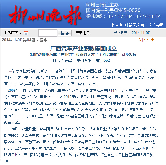 柳州晚报刊发广西汽车产业职教集团在我院成立的消息 来源:柳州职业技术学院新闻网 作者:石玉丹 编审: 发布时间:2014-11-09 浏览次数: 次 【字体:小 大】 分享到: 2014年11月7日,柳州晚报在第4版,以“广西汽车产业职教集团成立”为题,刊发广西汽车产业职教集团在我院成立的消息。(截图:石玉丹) 关闭 打印正文