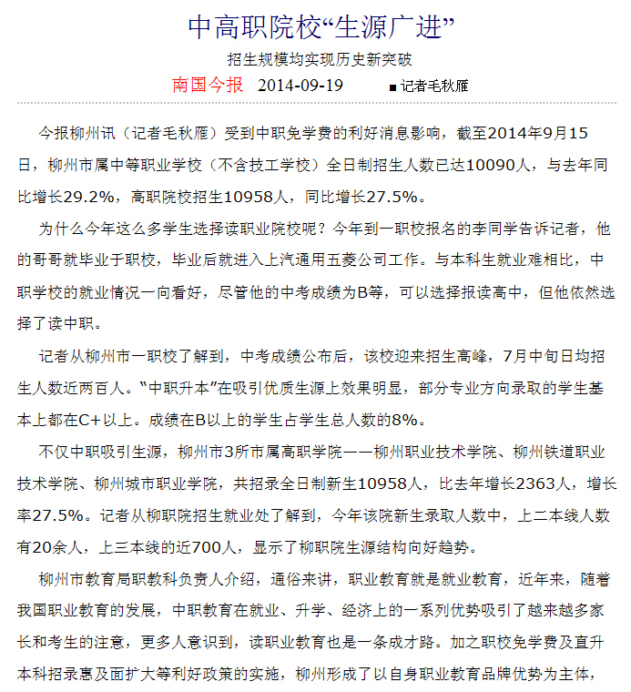 南国今报刊发我院生源结构向好趋势的新闻 来源:柳州职业技术学院新闻网 作者:石玉丹 编审: 发布时间:2014-11-21 浏览次数: 次 【字体:小 大】 分享到: 2014年9月19日,南国今报在第6版以“中高职院?!垂憬蔽猓⑽以荷唇峁瓜蚝们魇频男挛?。(截图:石玉丹) 关闭 打印正文