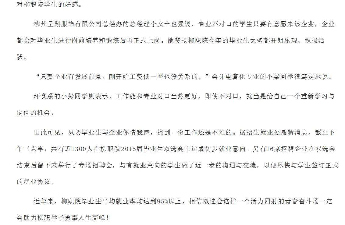 柳州教育局网站发布我院2015届毕业生双选会开幕的信息 来源:柳州职业技术学院新闻网 作者:崔智慧 编审: 发布时间:2014-12-02 浏览次数: 次 【字体:小 大】 分享到: 12月1日,柳州教育局网站发布我院2015届毕业生双选会开幕的信息。(崔智慧) 信息截图 关闭 打印正文