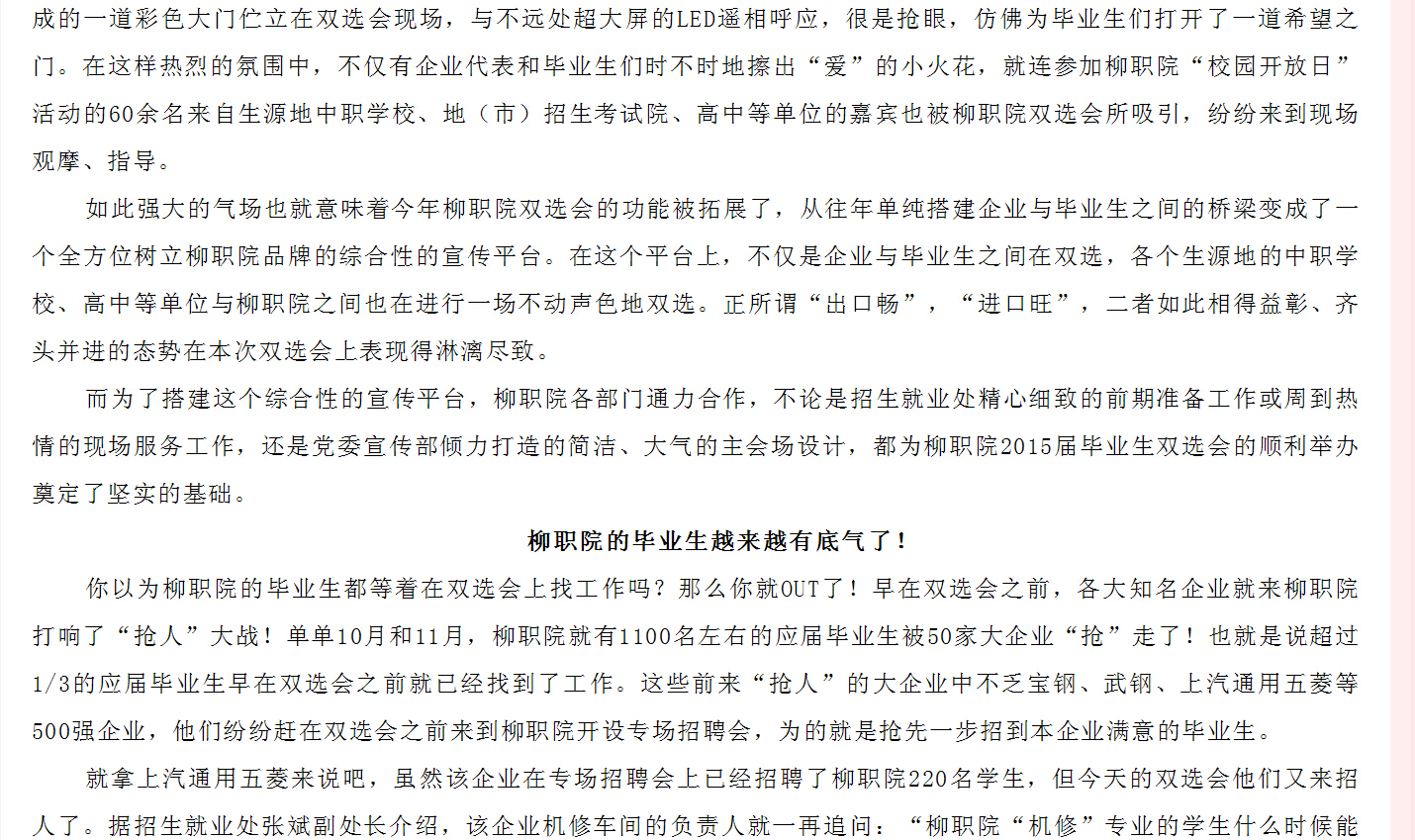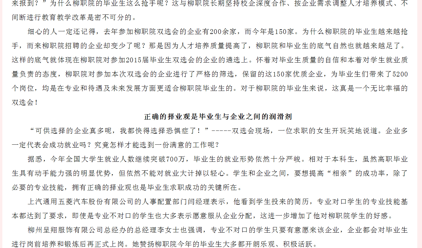 广西教育厅网站发布我院2015届毕业生双选会开幕的信息 来源:柳州职业技术学院新闻网 作者:崔智慧 编审: 发布时间:2014-12-25 浏览次数: 次 【字体:小 大】 分享到: 12月9日,广西教育厅网站发布我院2015届毕业生双选会开幕的信息。(崔智慧) 信息截图 关闭 打印正文