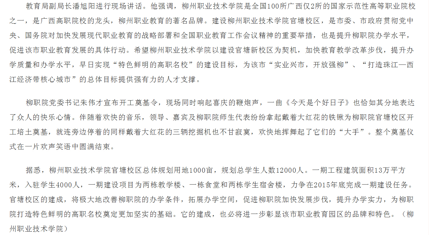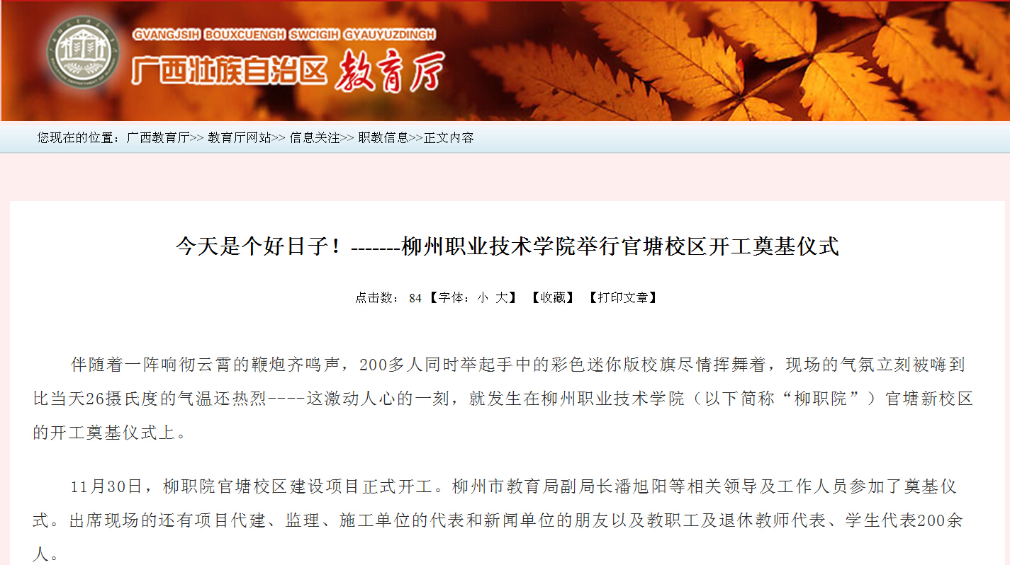 广西教育厅网站发布我院举行官塘校区开工奠基仪式的信息 来源:柳州职业技术学院新闻网 作者:崔智慧 编审: 发布时间:2014-12-25 浏览次数: 次 【字体:小 大】 分享到: 12月9日,广西教育厅网站发布我院举行官塘校区开工奠基仪式的信息。(崔智慧) 信息截图 关闭 打印正文