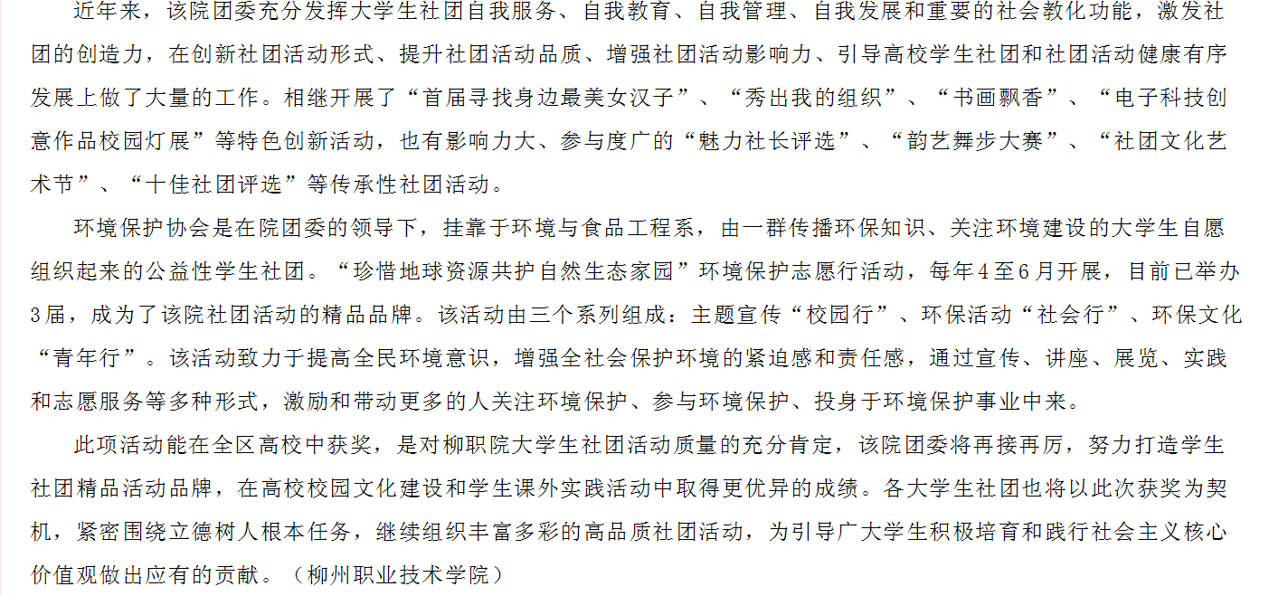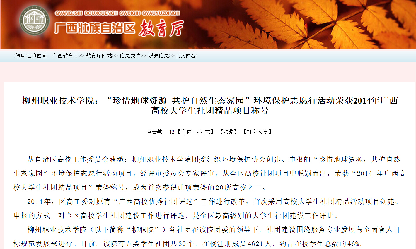 12月24日,广西教育厅网站发布我院“珍惜地球资源 共护自然生态家园”环境保护志愿行活动荣获2014年广西高校大学生社团精品项目称号的信息。(崔智慧)