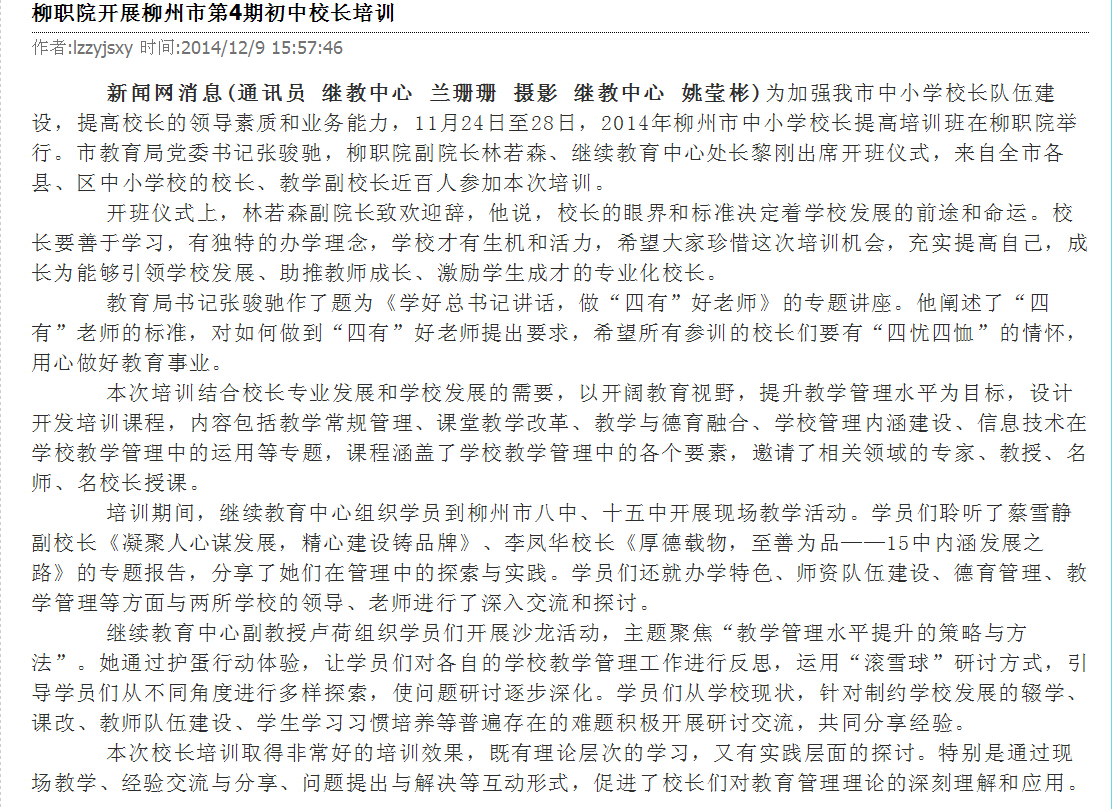 柳州教育局网站发布我院开展柳州市第4期初中校长培训的信息 来源:柳州职业技术学院新闻网 作者:崔智慧 编审: 发布时间:2014-12-26 浏览次数: 次 【字体:小 大】 分享到: 12月12日,柳州教育局网站发布我院开展柳州市第4期初中校长培训的信息。(崔智慧) 信息截图 关闭 打印正文