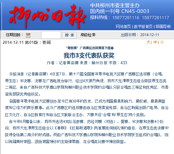 柳州日报刊发我院合唱队在全国赛事中获优秀奖的新闻 来源:柳州职业技术学院新闻网 作者:石玉丹 编审: 发布时间:2015-01-04 浏览次数: 次 【字体:小 大】 分享到: 2014年12月11日,柳州日报在头版,以“我市3支代表队获奖”为题,刊发我院合唱队在全国青年歌手电视大奖赛广西赛区选拔赛中,获得优秀奖的新闻。(截图:石玉丹) 关闭 打印正文