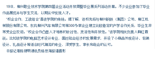 柳州日报刊发我院学生受企业青睐的新闻 来源:柳州职业技术学院新闻网 作者:石玉丹 编审: 发布时间:2015-01-05 浏览次数: 次 【字体:小 大】 分享到: 2014年12月22日,柳州日报在第4版,以“校企深度交融,职校生受青睐”为题,刊发我院举办第四届企业活动开放周暨毕业展系列活动的新闻。(截图:石玉丹) 关闭 打印正文