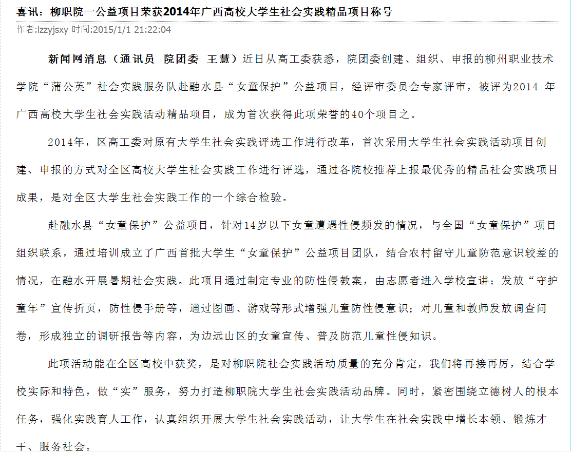 柳州教育局网站发布我院公益项目荣获2014年广西高校大学生社会实践精品项目称号的信息 来源:柳州职业技术学院新闻网 作者:崔智慧 编审: 发布时间:2015-01-05 浏览次数: 次 【字体:小 大】 分享到: 2015年1月4号,柳州教育局网站发布我院公益项目荣获2014年广西高校大学生社会实践精品项目称号的信息。(崔智慧) 新闻截图 关闭 打印正文