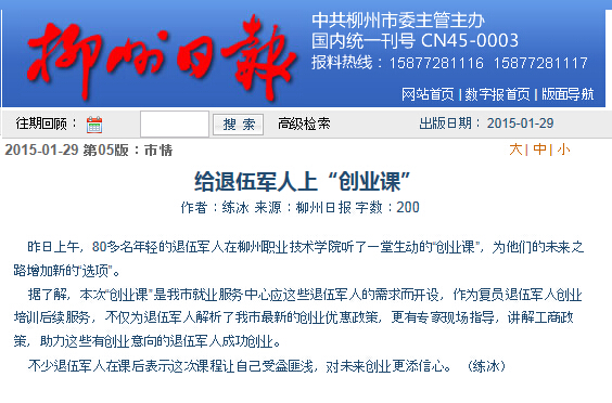 柳州日报近日刊发我院举办退伍军人技能培训班的消息 来源:柳州职业技术学院新闻网 作者:石玉丹 编审: 发布时间:2015-02-05 浏览次数: 次 【字体:小 大】 分享到: 2015年1月29日,柳州日报在第5版刊发我院举办退伍军人技能培训班的消息。(截图:石玉丹) 关闭 打印正文