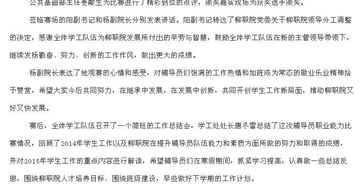 柳州教育局网站发布我院举办辅导员职业能力竞赛演讲比赛的信息 来源:柳州职业技术学院新闻网 作者:崔智慧 编审: 发布时间:2015-03-05 浏览次数: 次 【字体:小 大】 分享到: 2015年1月22日,柳州教育局网站发布我院举办辅导员职业能力竞赛演讲比赛的信息。(崔智慧) 信息截图 关闭 打印正文