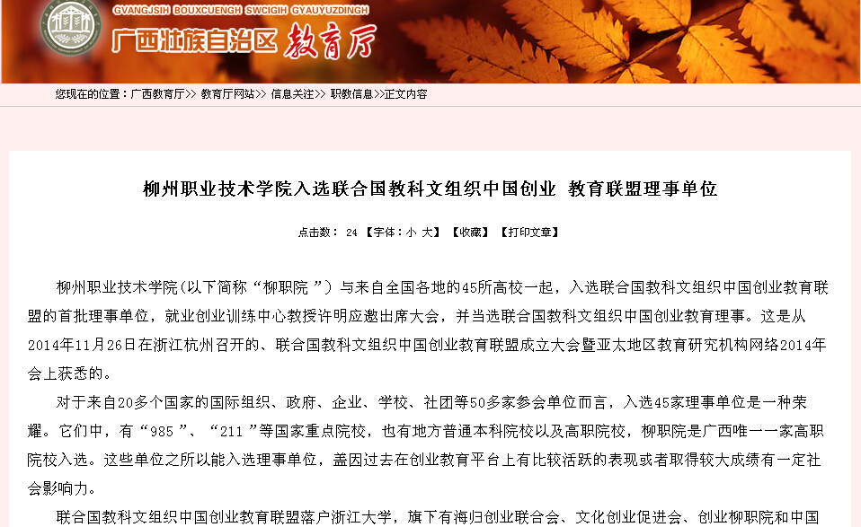 广西教育厅网站发布学院入选联合国教科文组织中国创业教育联盟理事单位的信息 来源:柳州职业技术学院新闻网 作者:崔智慧 编审: 发布时间:2015-03-05 浏览次数: 次 【字体:小 大】 分享到: 2015年1月20日,广西教育厅网站发布学院入选联合国教科文组织中国创业教育联盟理事单位的信息。(崔智慧) 信息截图 关闭 打印正文