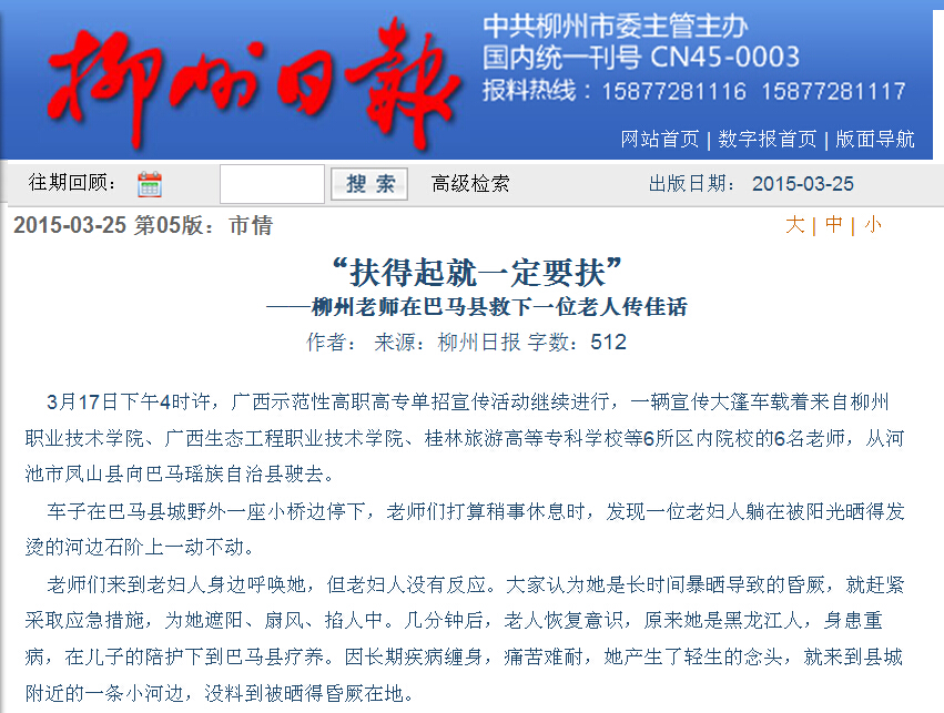 柳州日报近日刊发有我院老师参加的一次学雷锋救援行动 来源:柳州职业技术学院新闻网 作者:石玉丹 编审: 发布时间:2015-03-25 浏览次数: 次 【字体:小 大】 分享到: 2015年3月25日,柳州日报在第五版,以“扶得起就一定要扶”为题,刊发有我院老师参加的一次学雷锋救援行动。(截图:石玉丹) 关闭 打印正文