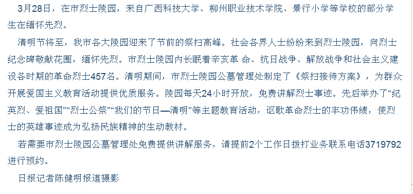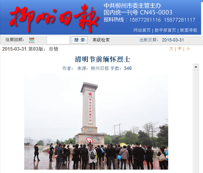 柳州日报近日刊发我院学生祭奠烈士墓的新闻 来源:柳州职业技术学院新闻网 作者:石玉丹 编审: 发布时间:2015-04-10 浏览次数: 次 【字体:小 大】 分享到: 2015年3月31日,柳州日报在第3版,以“清明节前缅怀烈士”为题,刊发我院学生祭奠烈士墓的新闻。(截图:石玉丹) 关闭 打印正文