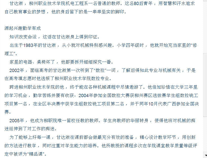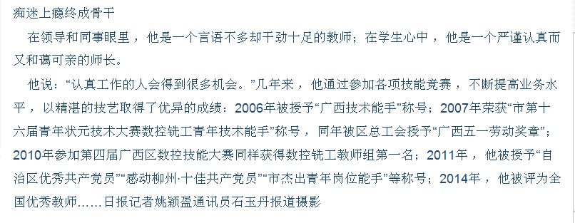 柳州日报近日刊发我院教师在教育工作上创新教学的新闻 来源:柳州职业技术学院新闻网 作者:石玉丹 编审: 发布时间:2015-04-29 浏览次数: 次 【字体:小 大】 分享到: 2015年4月14日,柳州日报在第7版,以“痴迷数控创新教学收获颇丰”为题,刊发我院教师甘达淅在教育工作上创新教学的新闻。(截图:石玉丹) 关闭 打印正文