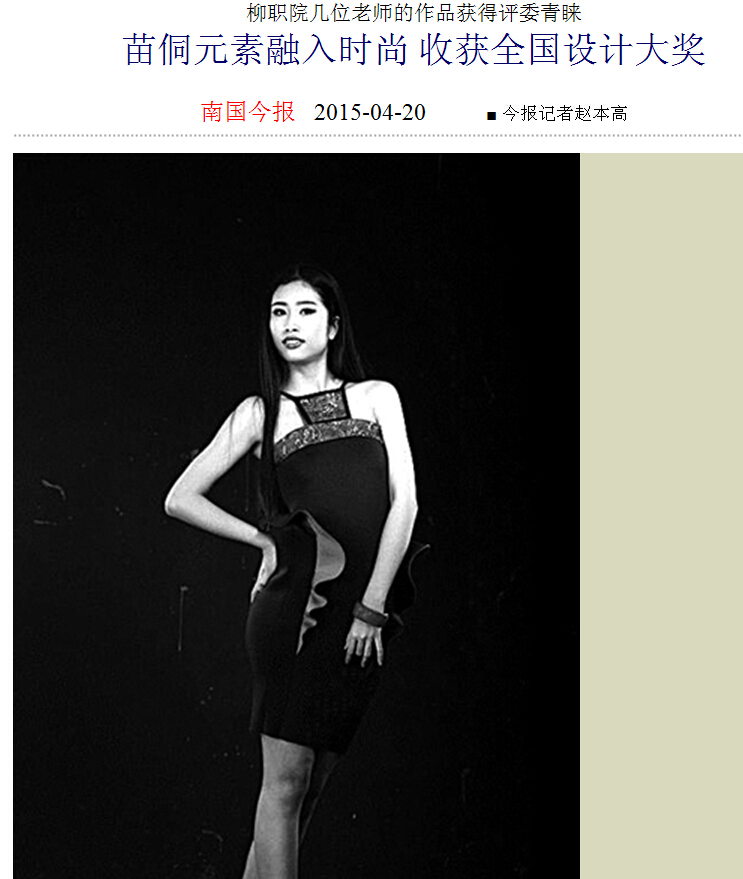 南国今报近日刊发我院艺术系老师获全国设计大奖的新闻 来源:柳州职业技术学院新闻网 作者:石玉丹 编审: 发布时间:2015-04-29 浏览次数: 次 【字体:小 大】 分享到: 2015年4月20日,南国今报在第5版,以“苗侗元素融入时尚,收获全国设计大奖”为题,刊发我院艺术系几位老师获得全国大奖的新闻。(截图:石玉丹) 关闭 打印正文