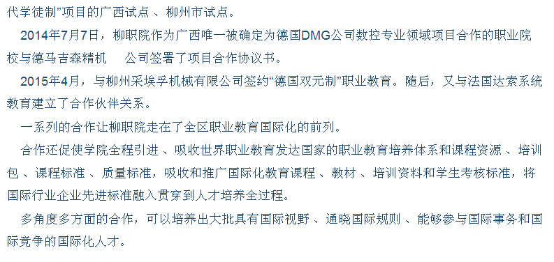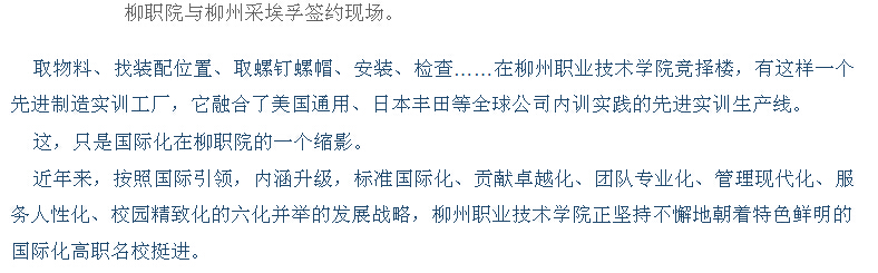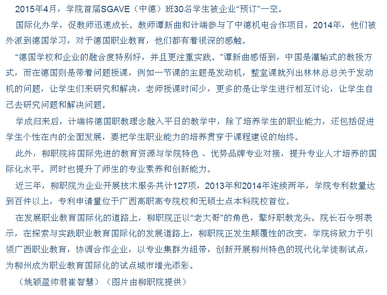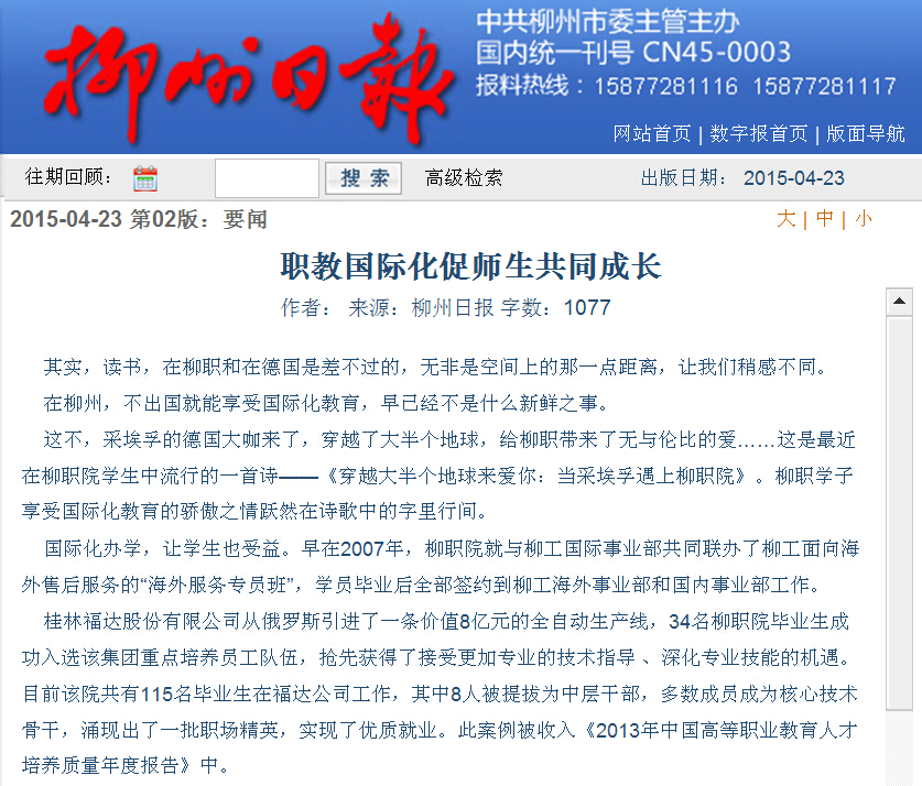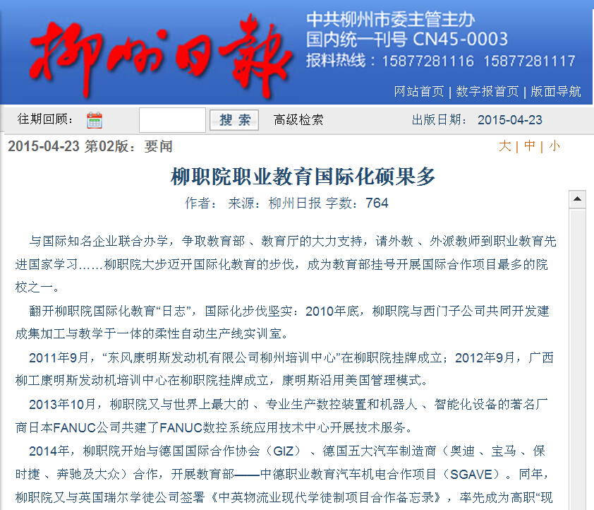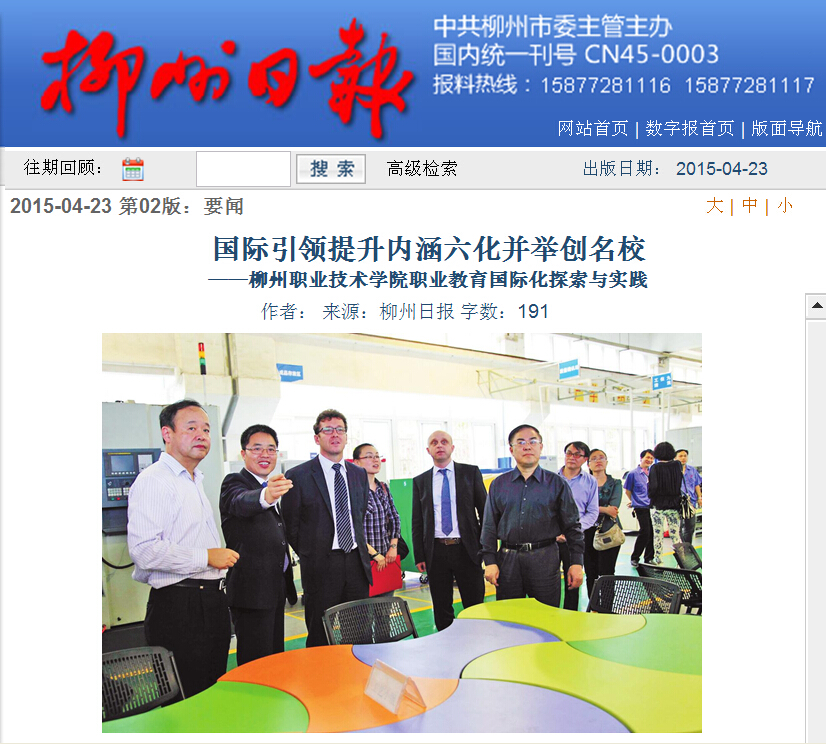 柳州日报近日刊发我院国际化办学的成就性报道 来源:柳州职业技术学院新闻网 作者:石玉丹 编审: 发布时间:2015-04-29 浏览次数: 次 【字体:小 大】 分享到: 2015年4月23日,柳州日报在第2版,以“国际引领,提升内涵,六化并举创名?!蔽?,大篇幅刊发我院国际化办学的成就性新闻。(截图:石玉丹) 关闭 打印正文