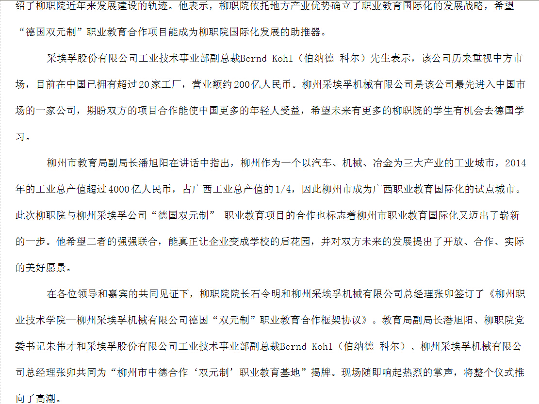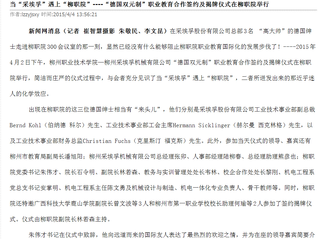 柳州教育局网站发布“德国双元制”职业教育合作签约及揭牌仪式在我院举行的信息 来源:柳州职业技术学院新闻网 作者:崔智慧 编审: 发布时间:2015-05-04 浏览次数: 次 【字体:小 大】 分享到: 2015年4月7日,柳州教育局网站发布“德国双元制”职业教育合作签约及揭牌仪式在我院举行的信息。(崔智慧) 关闭 打印正文