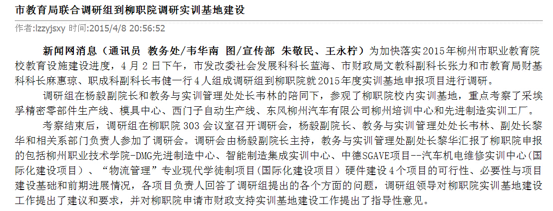 柳州教育局网站发布市教育局联合调研组到我院调研实训基地建设的信息 来源:柳州职业技术学院新闻网 作者:崔智慧 编审: 发布时间:2015-05-04 浏览次数: 次 【字体:小 大】 分享到: 2015年4月13日,柳州教育局网站发布市教育局联合调研组到我院调研实训基地建设的信息。(崔智慧) 关闭 打印正文