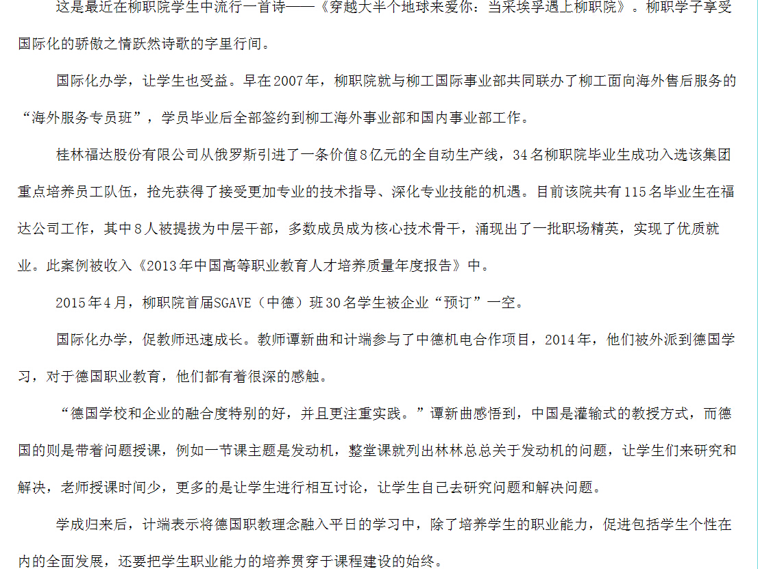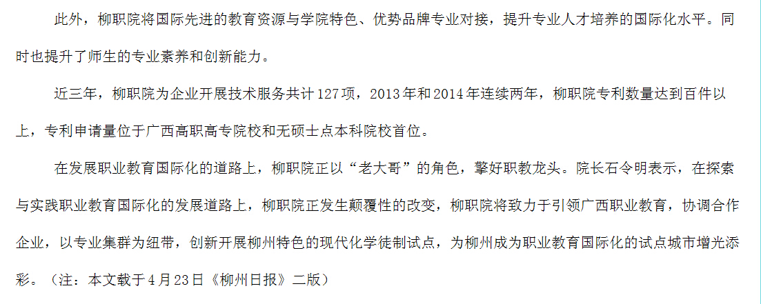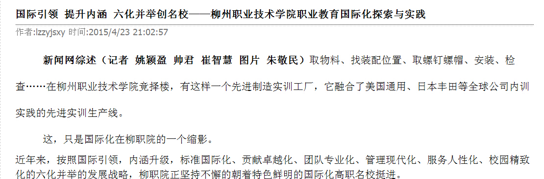 柳州教育局网站发布我院职业教育国际化探索与实践的信息 来源:柳州职业技术学院新闻网 作者:崔智慧 编审: 发布时间:2015-05-04 浏览次数: 次 【字体:小 大】 分享到: 2015年4月28日,柳州教育局网站发布我院职业教育国际化探索与实践的信息。(崔智慧) 关闭 打印正文