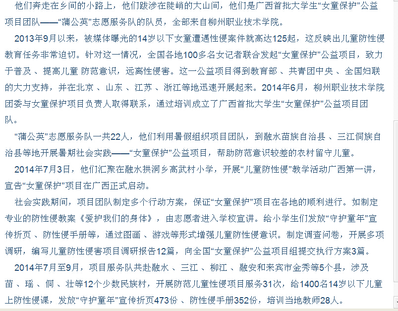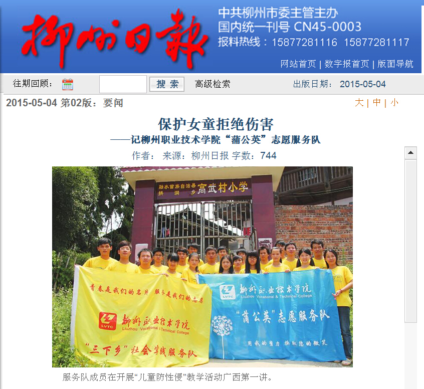 柳州日报近日刊发我院志愿者开展公益活动的新闻 来源:柳州职业技术学院新闻网 作者:石玉丹 编审: 发布时间:2015-05-06 浏览次数: 次 【字体:小 大】 分享到: 2015年5月4日,柳州日报在第2版,以“保护女童拒绝伤害”为题,刊发我院志愿者开展公益活动的新闻。(截图:石玉丹) 关闭 打印正文