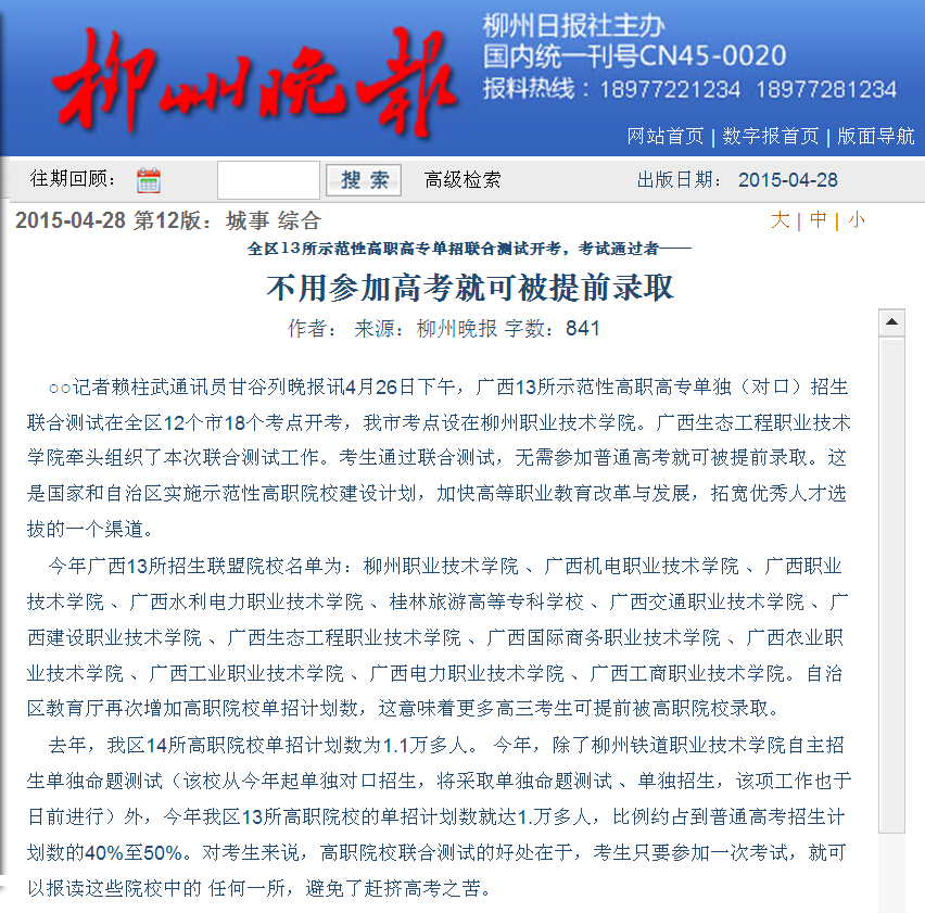 柳州晚报刊发我院举行单招考试的新闻 来源:柳州职业技术学院新闻网 作者:石玉丹 编审: 发布时间:2015-05-22 浏览次数: 次 【字体:小 大】 分享到: 2015年4月28日,柳州晚报在第12版,以“不用参加高考就可被提前录取”为题,刊发我院举行单招考试的新闻。(截图:石玉丹) 关闭 打印正文