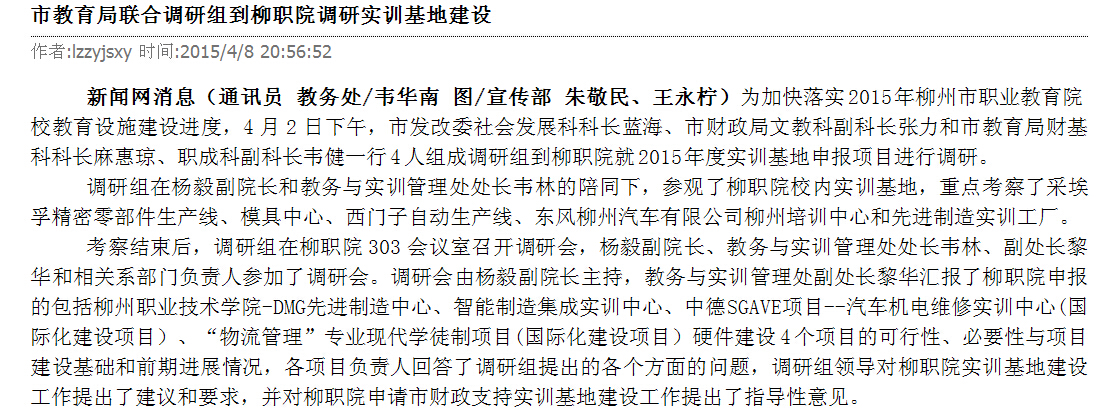 柳州教育局网站发布市教育局联合调研组到我院调研实训基地建设的信息 来源:柳州职业技术学院新闻网 作者:崔智慧 编审: 发布时间:2015-05-27 浏览次数: 次 【字体:小 大】 分享到: 2015年4月13日,柳州教育局网站发布市教育局联合调研组到我院调研实训基地建设的信息。(崔智慧) 关闭 打印正文